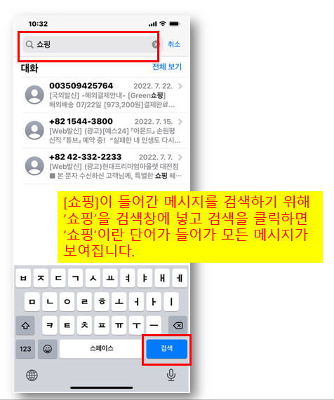 3. 원하는 검색어를 치고 [검색]을 클릭하면 검색어가 들어간 모든 메시지가 뜨게 되므로 손쉽게 원하는 메시지를 찾을 수 있습니다.