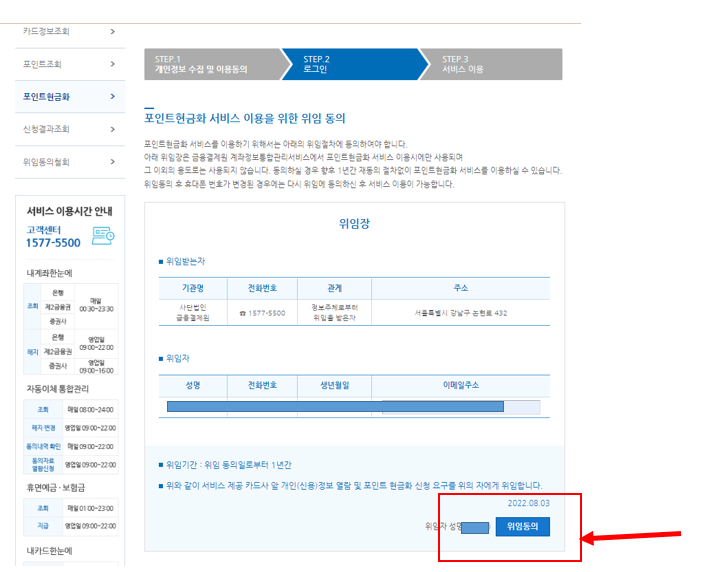 8. 포인트현금화 서비스 이용을 위한 위임 동의가 나오고 위임장을 작성해야 합니다. 내용을 확인하고 [위임 동의]를 클릭합니다.