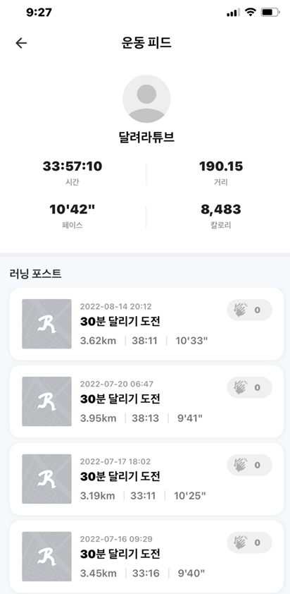 그래 결심했어! 운동을 시작하자. 저녁 8시가 다되어 어슬렁 운동을 나갔다. 이전에 하던 런데이 앱을 이용하여 30분 달리기 운동을 하기로 했다. 7월에 5주 2회차 운동까지 하고, 8월에는 전혀 운동을 하지 않았다.