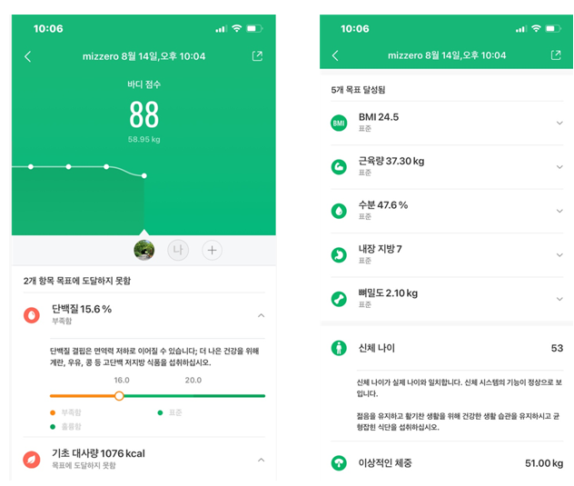 오늘자 나의 신체상태이다. 체붕계는 샤오미 체중계를 이용하고 있다. 체중은 58.95 kg, 바디점수는 88점이다. 바디점수가 7월보다 낮아졌다. 기초대사량은 1076 kcal 밖에 되지 않는다. 기초대사량을 올리기 위해 근육을 늘리기 위한 운동도 병행해야 한다. 오늘 런데이 달리기를 마치고 스쿼트 50개씩 3세트, 런지 15개씩 3세트를 추가로 했다. 유산소운동과 근육운동을 병행하여 관리해보자.