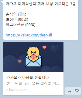 카카오 데이터센터 화재보상 이모티콘 3종은 춘식이, 토심이, 망그러진 곰입니다. 무료사용기한은 다음과 같습니다.