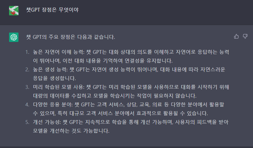 챗GPT 장점이 무엇인지 물어보았다.