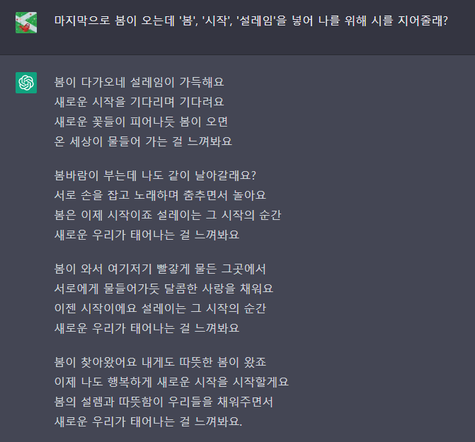 라는 질문을 했다. 쳇GPT가 나를 위해 지어준 봄날의 시이다. 행복하게 봄을 시작해봐야겠다.