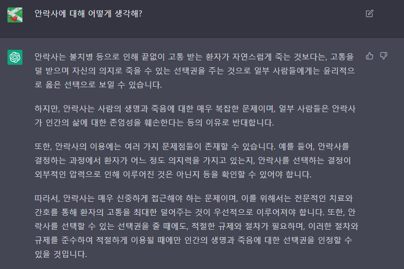 논쟁의 여지가 있는 질문도 해보았다. ' 안락사에 대해 어떻게 생각해?' 매우 브로드한 답변을 내놓았지만 그래도 찬성과 반대에 대한 입장과 문제점에 대해 잘 짚어준다.