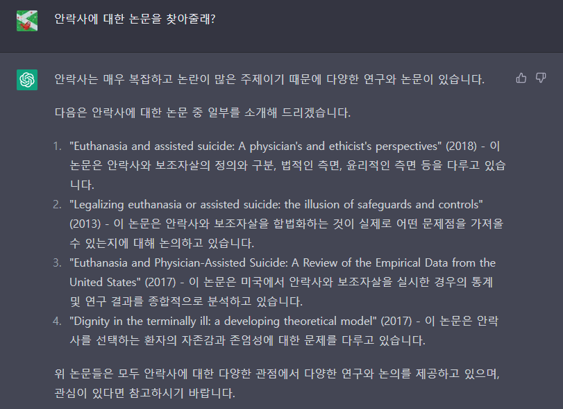 그래서 '안락사에 대한 논문을 찾아줄래?' 라고 물었더니 일허게 여러개의 논문을 찾아주었다. 레포트를 작성하거나 할 때 활용하면 정말 좋을 것 같다.