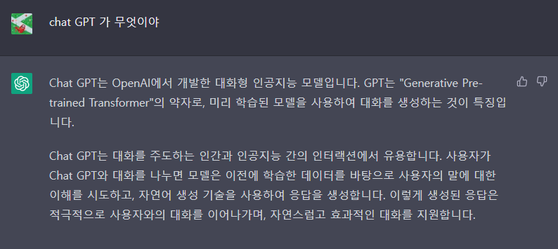 하지만 이제까지의 AI와는 차원이 다른 AI임에 틀림없습니다. 그래서 챗GPT가 무엇인지 챗 GPT에게 물어보았습니다. 한국어도 너무 자연스럽게 이해하고 질문에 대한 답변을 해주어 아주 흥미로웠습니다.