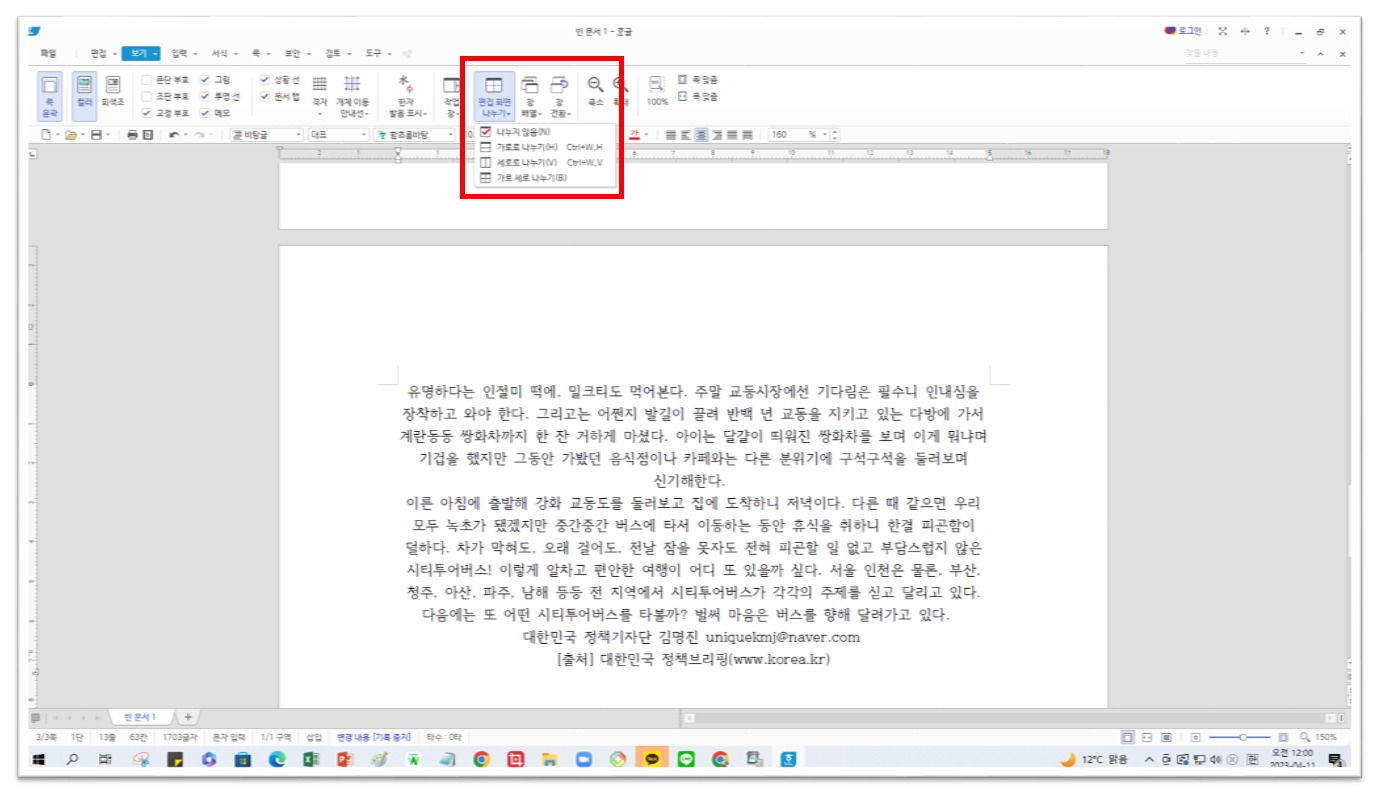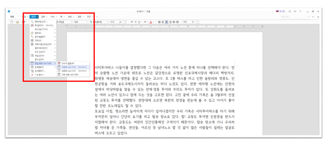 편집화면을 나누는 방법은 한컴오피스의 가장 상단에 위치한 기본 메뉴바 - 보기 탭 - 편집화면 나누기 순으로 들어가서 편집화면 나눌 수 있다. 화면을 나누는 방법은 가로나누기, 세로 나누기, 가로세로 나누기를 선택할 수 있다.