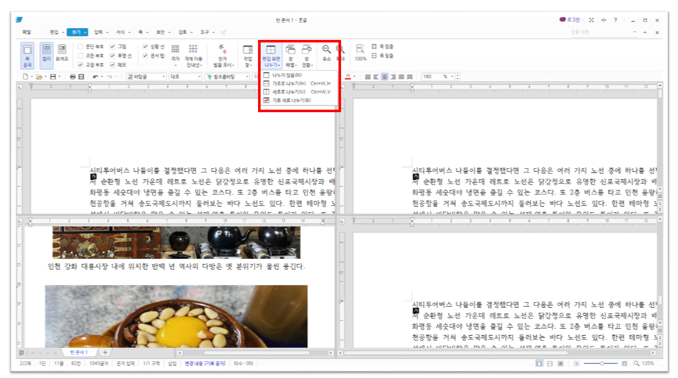 이런 경우에 사용할 수 있는 것이 [편집화면 나누기]이다. 화면을 분할하여 하나의 화면에 4개의 창까지 띄어 놓고 확인하며 문서작업을 할 수 있는 매우 스마트한 기능이다.