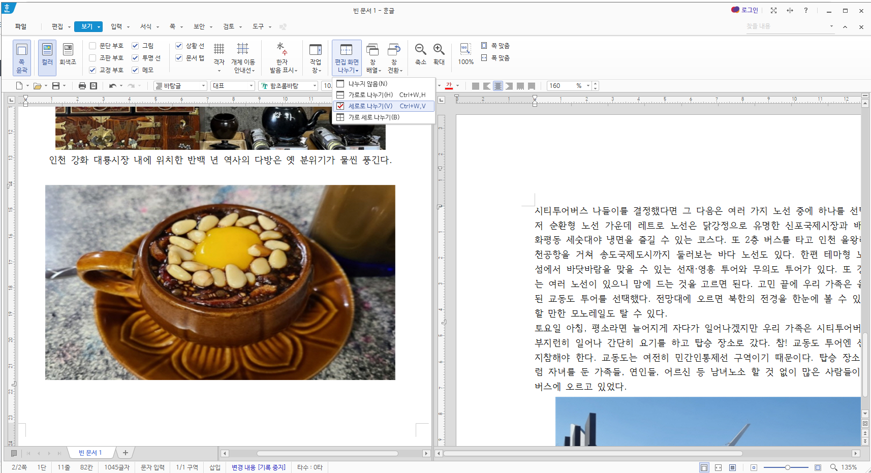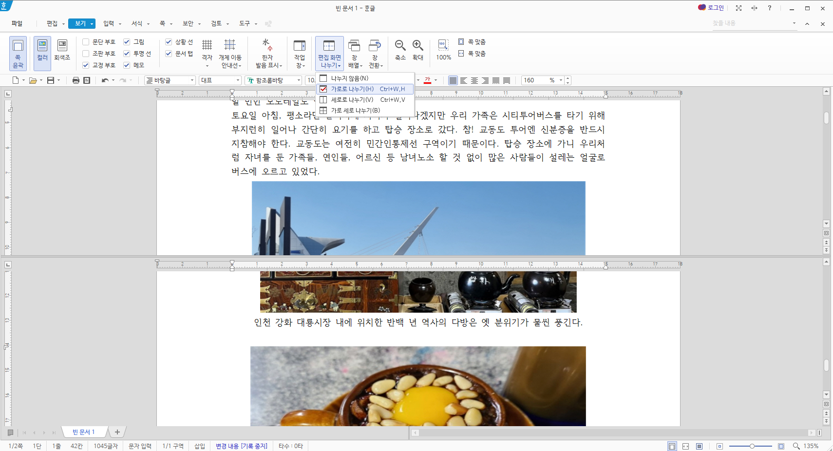 한글 문서를 작성하다 보면 뒷부분 작성 중에 앞의 내용을 보고 확인해야 하는 경우가 있다. 이 경우 페이지 수가 적으면 스크롤을 오르내리면서 확인할 수 있겠지만 페이지가 수 십장이 되면 이런 방법으로 스크롤을 위아래로 왔다 갔다 업무를 하는 데는 효율도 떨어지고 매우 불편하다.
