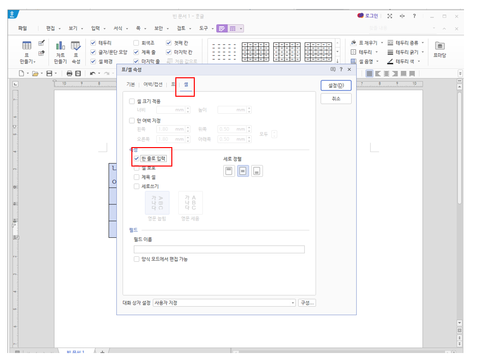 2. 단축 키 P(표/셀 속성)를 클릭합니다. 표/셀 속성 탭이 나오면 [셀] 탭을 클릭하고, 속성에서 [한 줄로 입력]을 선택합니다. 필요하면 세로 정렬에서 [가운데 정렬]을 선택하면 글자들이 한줄로 가운데 정렬됩니다.