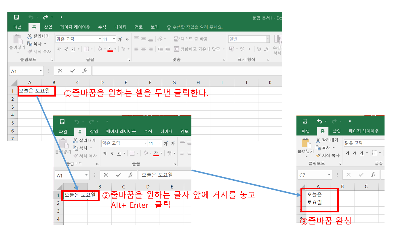 셀 안에서 글쓰기를 하던 중 그 셀안에서 줄 바꿈을 하고 싶은 경우에는 셀을 두 번 클릭하는 줄을 바꾸려는 위치를 클릭한 후 Alt + Enter키를 누른다.