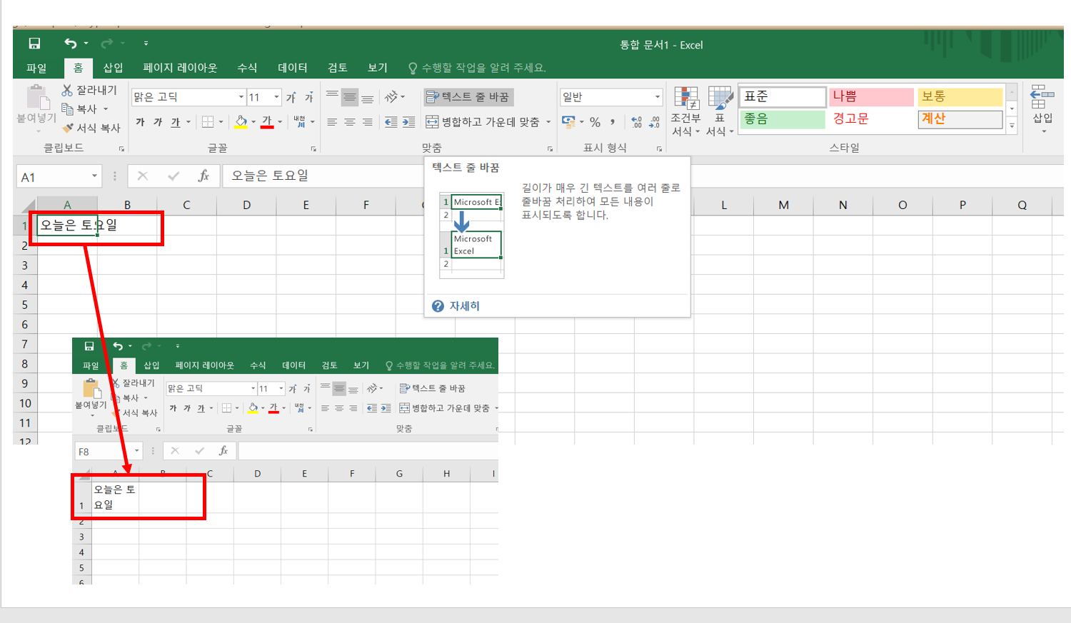 2. 홈 탭의 [맞춤] 영역에서 [텍스트 줄 바꿈]을 선택한다.