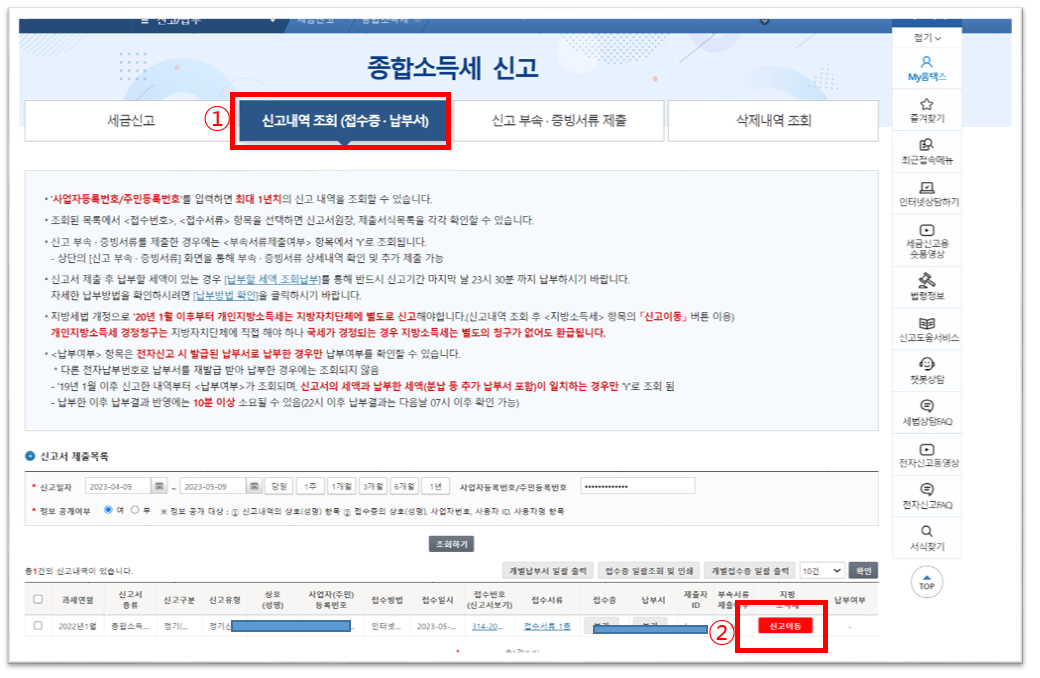2. 종합소득세 신고에서 [신고내역조회]를 클릭합니다. 아래 그림처럼 신고서 제출목록이 보입니다. [신고이동]을 클릭합니다. 그러면 [위텍스]로 자동 이동합니다.