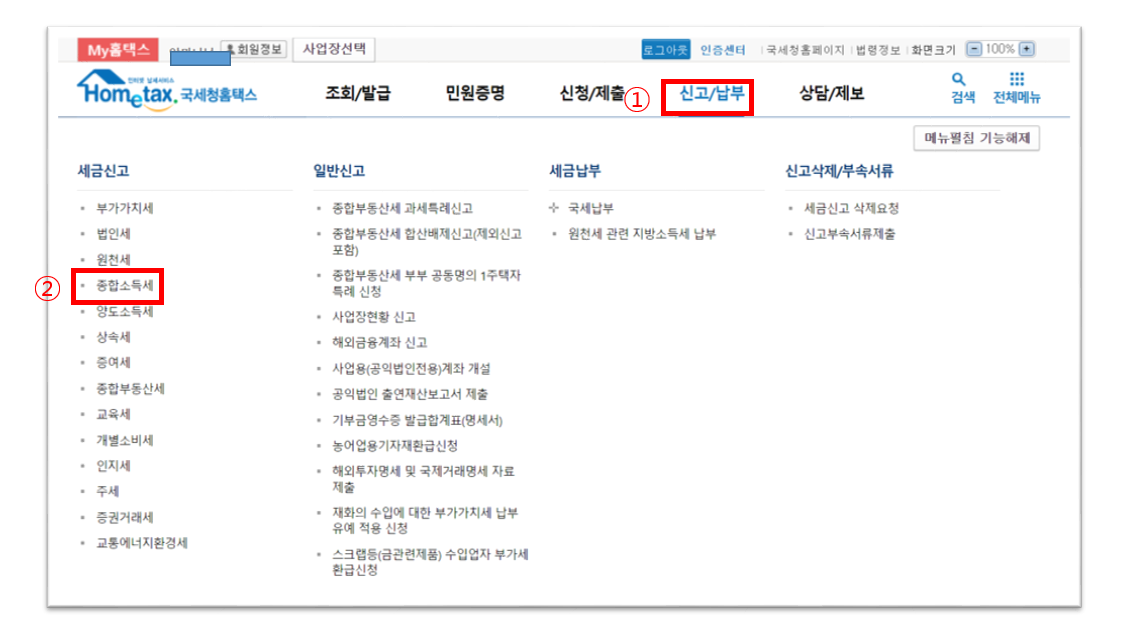 1. 홈텍스(https://www.hometax.go.kr)에 로그인한 후 [신고/납부]를 선택한 후 [종합소득세]를 클릭합니다.