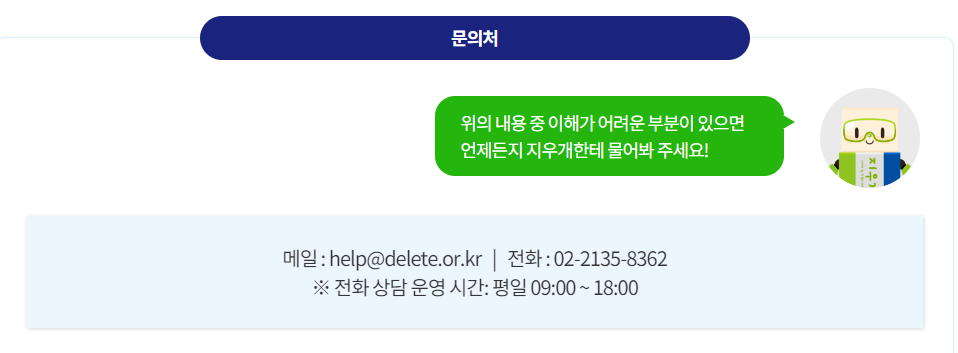 지우개 서비스 신청이 완료되면 지우개(잊힐 권리) 서비스 담당자는 신청내용을 확인한 후 해당 게시물의 게시판 관리자 등에게 삭제(또는 검색이 안되게 조치)를 요청하게 됩니다.