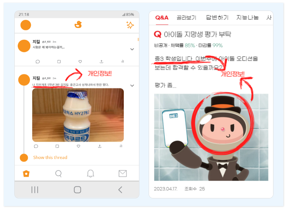 여기에서 개인정보를 포함한 게시물이란 이름, 생년월일, 전화번호, 주소, 사진 등으로 특정 개인을 알아볼 수 있는 정보를 포함하고 있는 게시물을 말합니다. 다음 예시를 통해 이해해 보기 바랍니다.