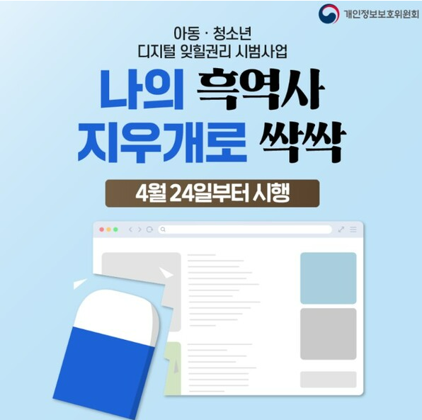 지우개서비스는 우리들의 잊힐 권리를 의미합니다. 아동 또는 청소년 시기에 작성한 게시물 중 개인정보가 포함되어 있는 게시물에 대해, 다른 사람이 검색하지 못하도록 도와주어 우리들의 소중한 개인정보를 지켜주는 서비스라고 할 수 있습니다.
