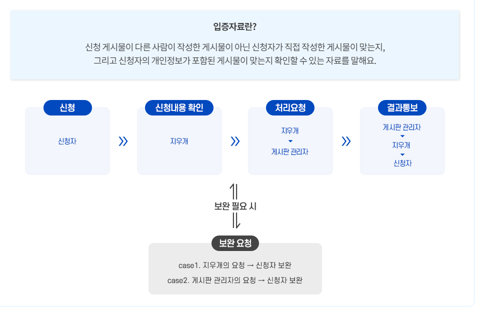 이 과정에서 지우개(잊힐권리)서비스 담당자와 게시판관리자는 지우개(잊힐 권리) 서비스를 신청한 사람(신청자)에게 입증자료를 보완해달라고 요청할수가 있습니다. 그리고 처리가 완료되면 그 결과를 신청자에게 알려주게 됩니다.