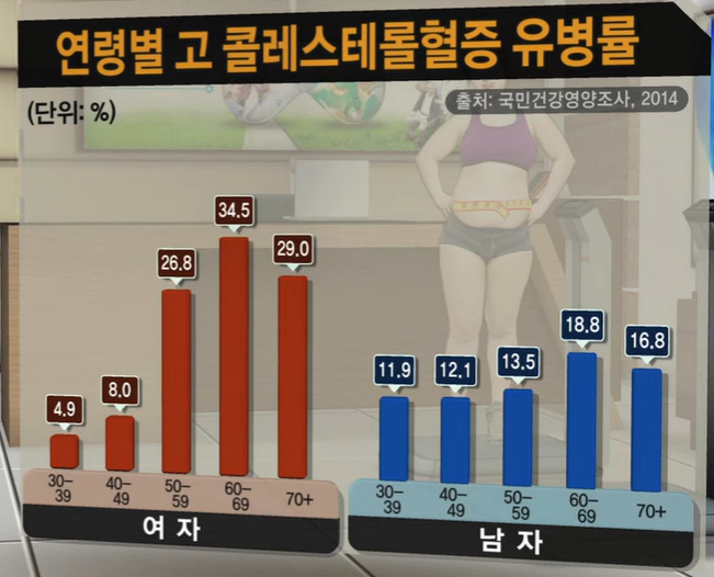 특히 이렇게 남아도는 내장지방은 흔히 혈액 내 콜레스테롤이 증가하는 콜레스테롤혈증으로 나타납니다. 우리나라 60대 여성의 고콜레스테롤혈증 유병률은 같은 나이 대의 남성보다 2배 이상 높게 나타나고 있습니다. 콜레스테롤은 우리 몸의 세포막을 만드는데 중요할 뿐만 아니라 우리 몸에 반드시 필요한 여러 가지 호르몬, 비타민 D, 지방소화에 필요한 담즙산을 만드는데도 꼭 필요한 물질입니다. 하지만 혈액 내에 과도한 포함된 콜레스테롤은 동맥의 혈관 벽에 침착하여 동맥경화를 촉진시킬 수 있습니다. 특히나 고혈압이 있다면 더욱 더 동맥경화의 진행이 빨라질 수 있습니다. 동맥경화증이 심장의 혈관에서 발생하면 허혈성 심장질환인 협심증이나 심근경색증을 유발할 수 있고, 뇌혈관에서 발생하면 뇌경색 등의 뇌졸중을 일을킬 수 있어 매우 위험한 증상입니다.