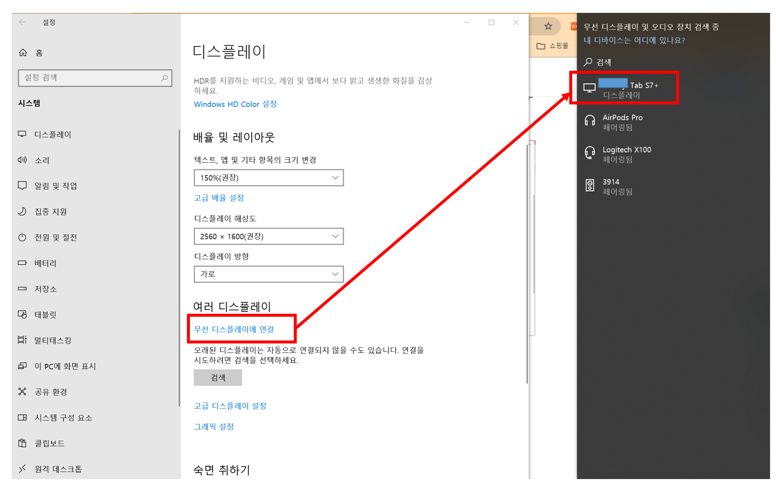 5. [무선디스플레 연결]을 클릭하면 우측에 연결할 수 있는 기기 리스트가 보입니다. 갤럭시 탭을 선택하면 연결됩니다.