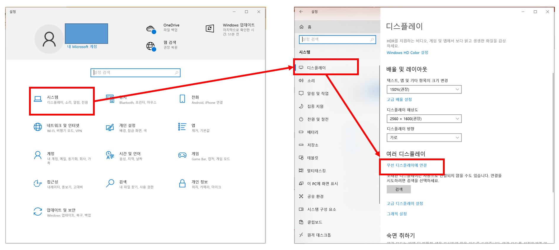 4. 설정을 선택하면 [시스템]으로 들어가게 되는데 맨 위의 [디스플레이]를 선택하고 디스플레이 화면에서 중간 정도에 [무선 디스플레이 연결]을 선택합니다.