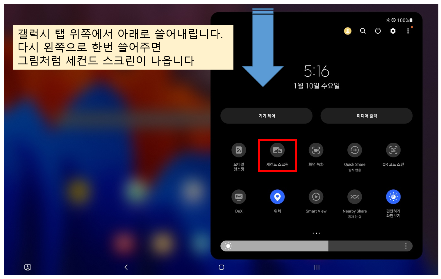 1. 갤럭시 탭 화면 위쪽에서 아래 쓸어내리고, 그 상태에서 다시 한번 우에서 좌로 쓸면 아래그림처럼 기기제어 화면에 [세컨드스크린]이 나옵니다.