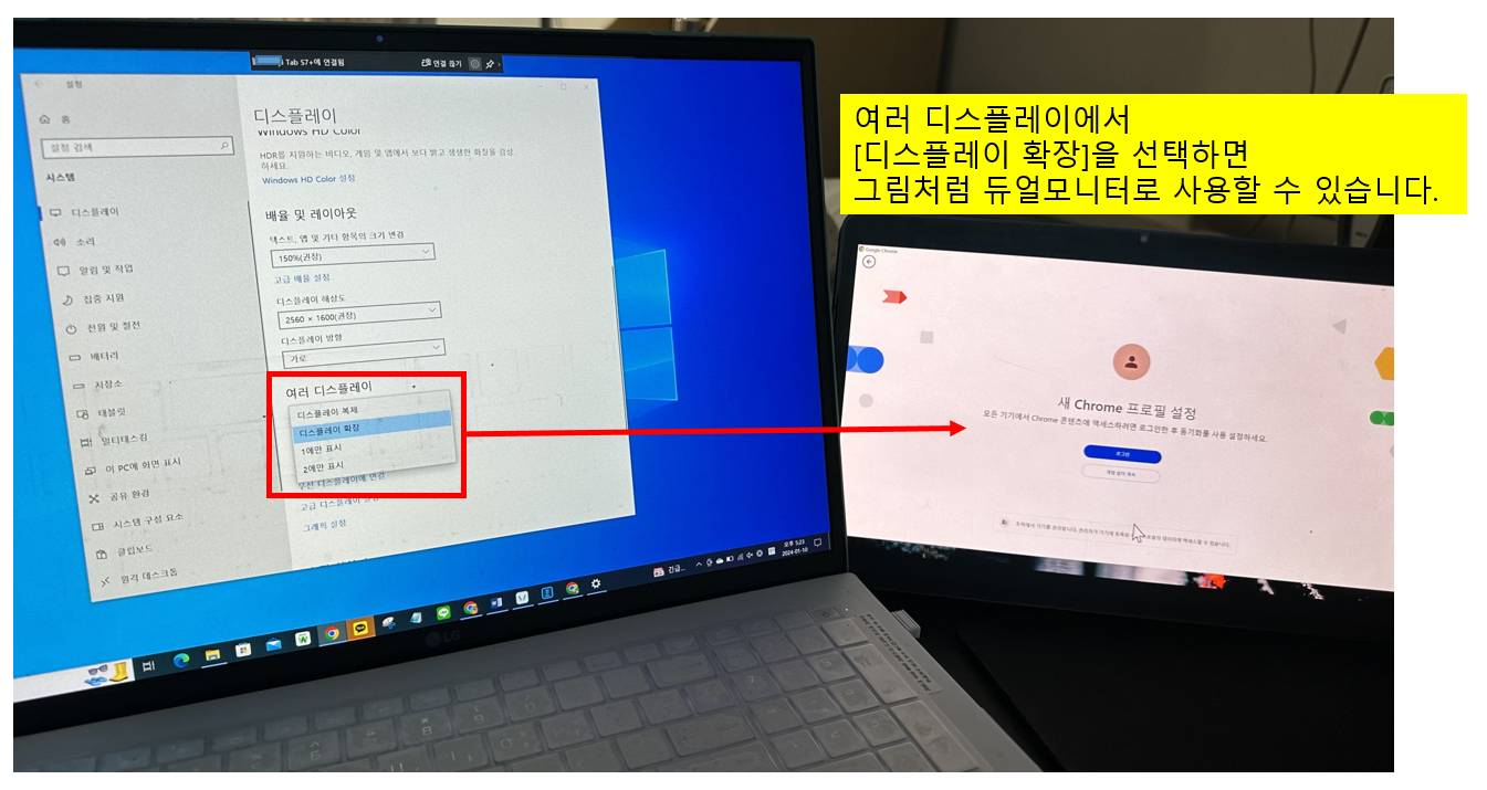 6. 듀얼모니터로 사용하려면 [여러 디스플레이]에서 [디스플레이 확장]을 선택하면 됩니다.