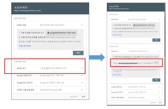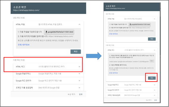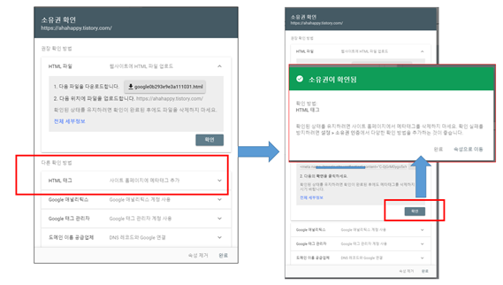3) 인증 확인 중... 이... 나오고 소유권 확인 화면이 나오면 아래 그림처럼 HTML태그를 선택하고 [확인]을 클릭합니다.