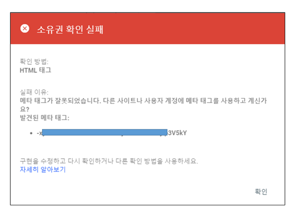 5) 소유권 확인 실패에서 확인을 클릭하면 이전 소유권 화면으로 되돌아갑니다. 다시 [HTML 태그]를 선택하여 메타태그를 아래 그림처럼 복사합니다.