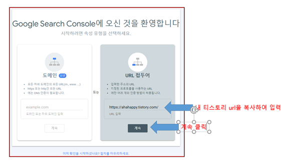 구글서치콘솔 우측의 [URL접두어] 란에 여러분의 티스토리 URL을 입력한 후 [계속]을 클릭합니다..