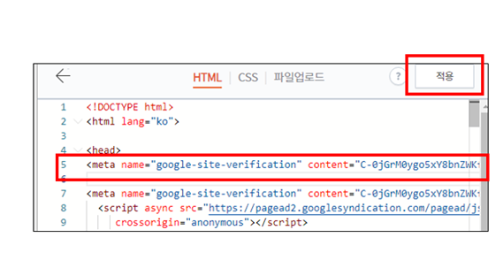 7) HTML편집 화면이 나오면 복사한 HTML 태그를 맨 위 <head><head> 아래 빈칸을 만들고 붙여 넣기를 한 후 [적용]을 클릭합니다.