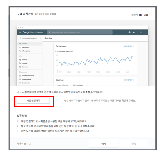 3) 구글서치콘솔을 더블클릭하여 들어가면 [계정연결하기]가 나옵니다. 클릭하면 구글 계정과 연결할 수 있도록 하는 화면이 나오는데 차례대로 선택하여 적용하면 됩니다. 차례대로 진행하면 연결되었습니다.라고 나오고 다시 아래 화면이 나옵니다. [적용]을 클릭하시면 됩니다.