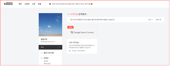 2) 검색란에 ‘서치콘솔’이라고 입력하고 엔터를 누릅니다. 아래 그림처럼 구글서치콘솔이 나옵니다. 현재 저는 사용 중이라서 [사용중][사용 중] 표시가 있습니다. 아직 사용 중이 아닌 분은 사용중 표시가 없을 것입니다.
