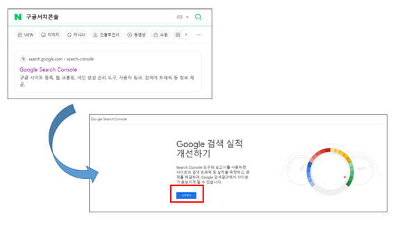 1) 포털검색에서 구글 서치콘솔을 검색하여 접속합니다. 구글서치콘솔에 접속한 후 [시작하기]를 클릭합니다. 구글이나 다음에서 하셔도 됩니다.