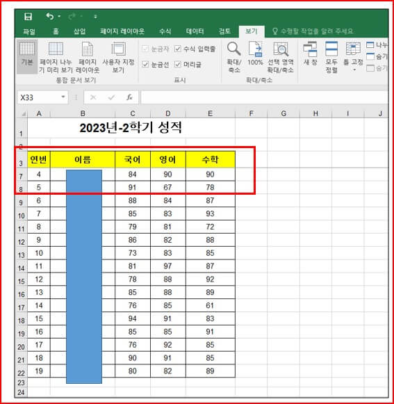 제목 행 틀고정 하는 방법