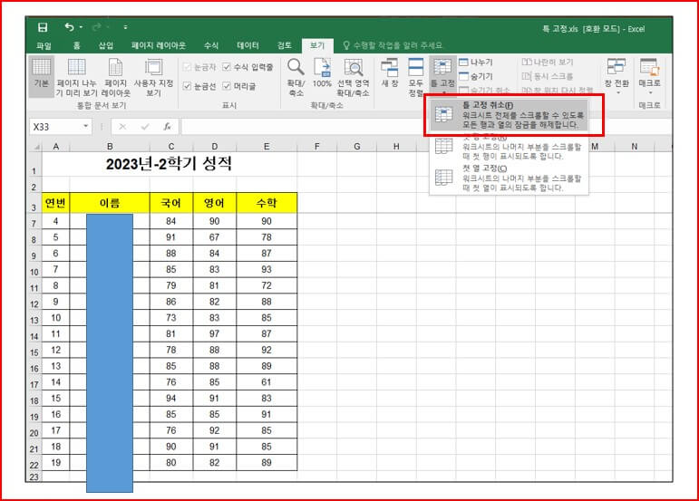 틀 고정 취소하는 방법