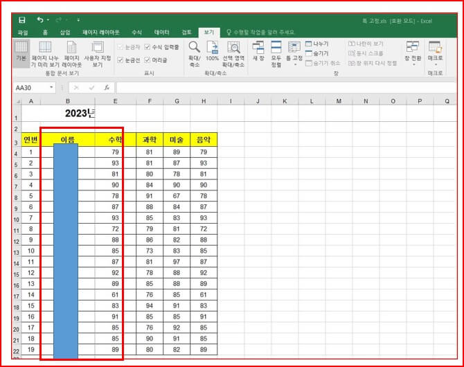 1. 아래 그림처럼 B열의 이름을 고정하고 싶다면 B열 옆의 C열을 선택하고 [보기] - [틀 고정] - [틀 고정]을 선택하면 됩니다.