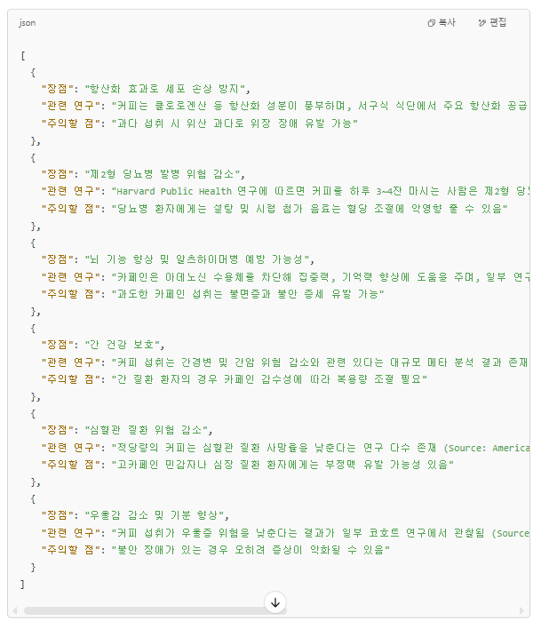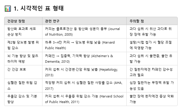 "커피의 건강상 장점을 JSON 형식으로 제공해 줘. {"장점": "", "관련 연구": "", "주의할 점": ""}"