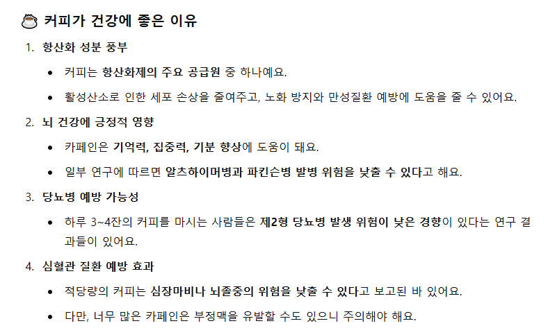 "챗GPT, 커피가 건강에 좋은 이유를 알려줘."