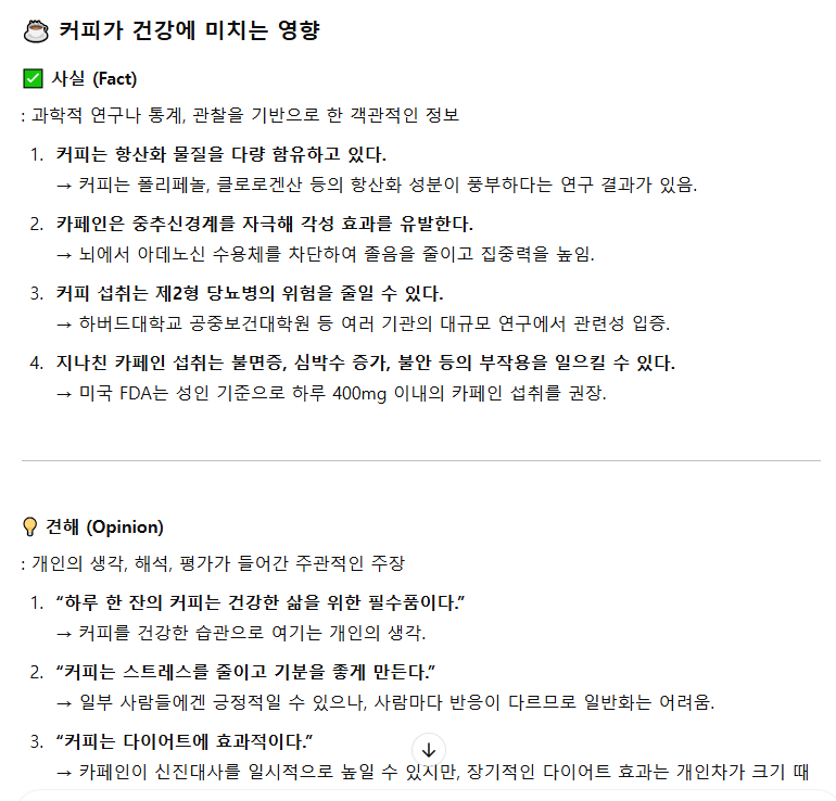 이렇게 프롬프트를 구성하면 챗GPT가 정보를 분류하여 제공하기 때문에 정확도가 향상됩니다. 단지 사실, 견해로 내용을 구분해서 정리하도록 했을 뿐인데도 훨씬 더 풍부한 자료를 얻을 수 있습니다.