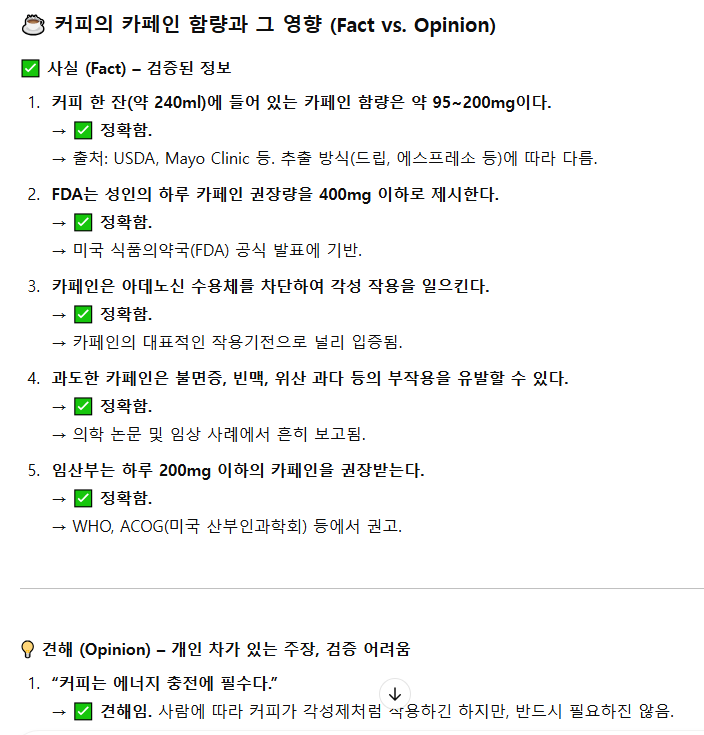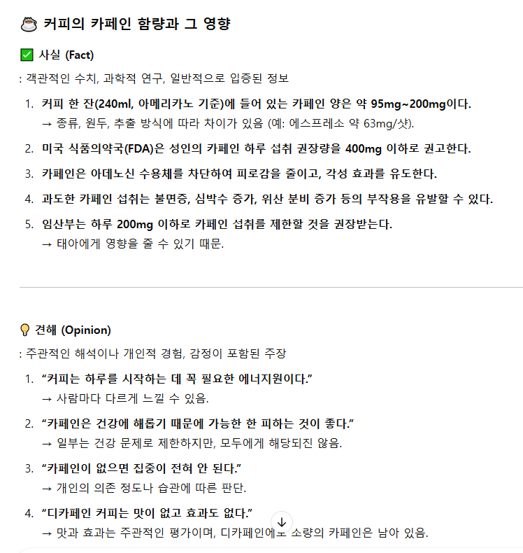 "커피의 카페인 함량과 그 영향에 대해 설명해 줘. (Fact vs. Opinion)"