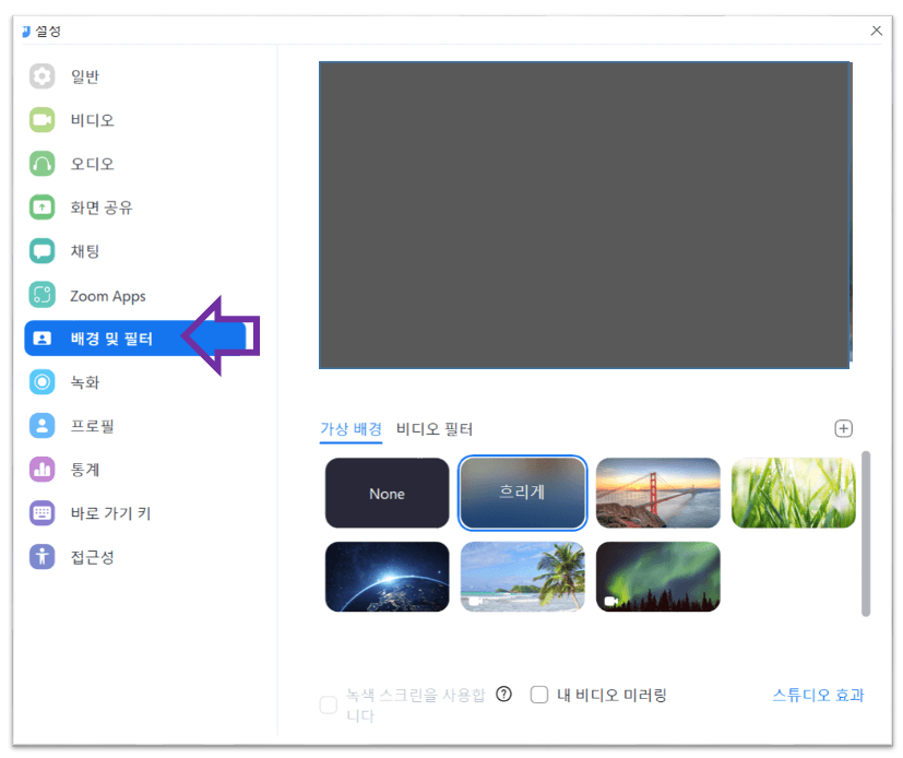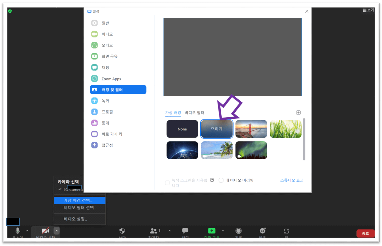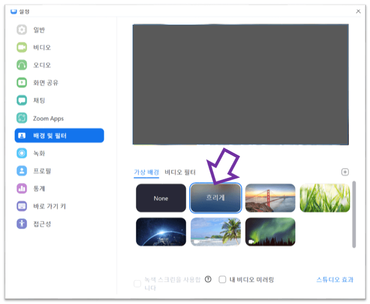 3. 환경설정에서 가상배경 화면을 설정했던 화면이 뜨게 됩니다. 화면에서 가상배경 중 [흐리게]를 선택합니다. 회의에서 비디오를 시작하면 가상배경이 [흐리게]로 즉시 자동 적용됩니다. 녹색 화면을 사용하는 동안에도 [흐리게]를 가상화면으로 선택하면 자동으로 '녹색 스크린을 사용합니다' 는 비활성화됩니다.