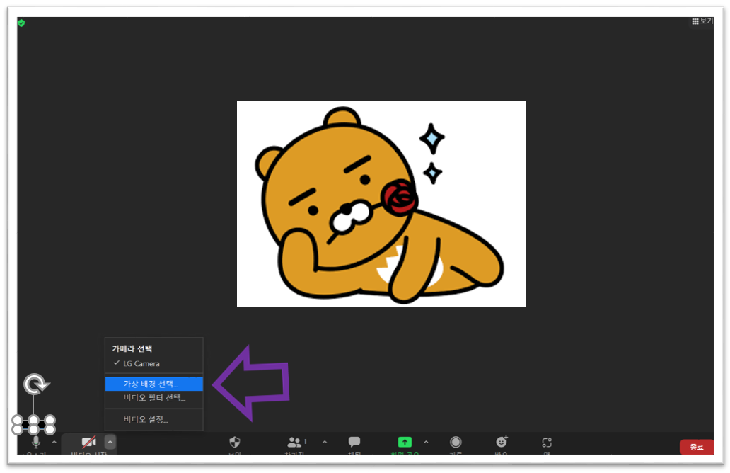 2. 줌 화면 좌측 아래 [비디오 시작] 버튼 옆에 있는 ( ^ ) 화살표 표시를 클릭하여 메뉴 중 [가상배경 선택] 탭을 클릭합니다.