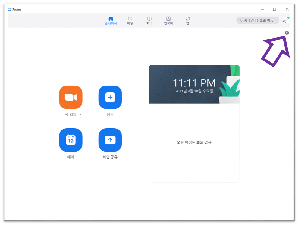 2. 줌 클라이언트 오른쪽 위에 위치한 환경설정 아이콘인 톱니바퀴를 클릭합니다.