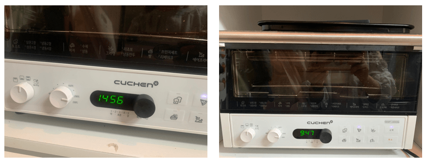 6. 이제 예열된 전기오븐이나 에어프라이에 피자를 넣고 굽기만 하면 됩니다. 저는 쿠첸 전기오븐을 사용했는데 이 오븐에는 [피자 굽기] 버튼이 있어요. 15분으로 세팅되는데 피자 토핑 올리면서 오븐을 켜 놓고 5분~6분 예열이 되면 그때 피자를 넣습니다. 예열된 오븐에서 9분 내외로 피자를 구우면 됩니다. 어느 정도 익었는지 감이 잘 오지 않으면 중간에 한번 열어보아도 됩니다.