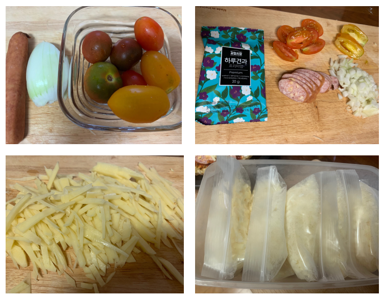 준비재료: 감자(먼저 채 썰어 버려서 사진이 없어요. 엄청 큰 어른 남자 주먹만 한 크기), 양파 조각, 잔슨빌 소시지, 방울토마토 몇 개(3개만 사용했어요), 하루견과 1봉, 계란 1개(사진에 빠졌네요 ㅠ), 그리고 모차렐라 치즈(쟁여 두고 먹어요)