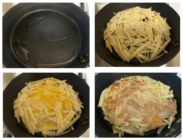 4. 프라이팬에 식용유를 조금 두르고(저는 튀겨지듯이 익혀지는 것이 좋아서 조금 더 많이 넣었어요) 감자채를 얇게 펴서 익혀줍니다. 중간에 지난번 '나 혼자 산다' 김지훈 표 식빵피자 만들 때 계란을 올려 단백질을 보충했던 것이 생각나서 계란을 하나 깨뜨려 골고루 펴 주었어요. 아래 부분이 노랗게 익고 계란이 좀 투명해지면 조심해서 뒤집개를 이용하여 계란을 뒤집어줍니다. 혹시 찢어진다 해도 큰 문제는 없으니 너무 실망하지 마세요.