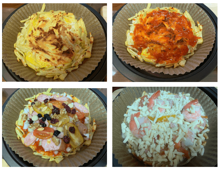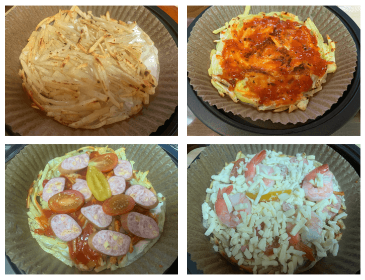 5. 둥그런 접시나 베이킹 트레이에 에어프라이용 유산지를 올립니다. 유산지 위에 감자채로 만든 피자 도우를 올리고 토마토 스파게티 소스를 골고루 펴 발라줍니다. 피자 토핑으로 쓸 양파, 저민 방울토마토, 소시지, 견과류를 올리고 모차렐라 치즈를 듬뿍 올려줍니다. 계란 담은 피자 만들면서 치즈 올린 사진을 빠뜨렸네요. 2번째로 만든 새우품은 피자 사진으로 대신했어요.(너무 엉성하죠?)