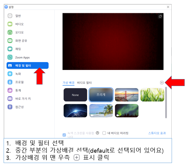 3. 설정 화면에서 좌측 메뉴바 중간에 잇는 [배경 및 필터]를 선택합니다.(선택하면 파랑색으로 표시됨) 가상 배경을 선택한 후 우측에 있는 (+) 표시를 클릭합니다.