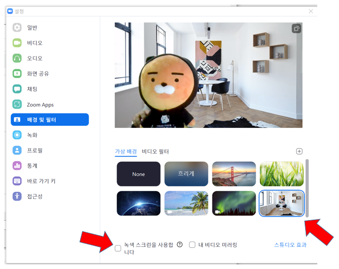 7. 이 때 맨 [아래 녹색 스크린을 사용합니다] 항목은 체크 해제되어 있어야 합니다, 잘 정돈된 거실에서 회의에 참여하는 것 같지요?